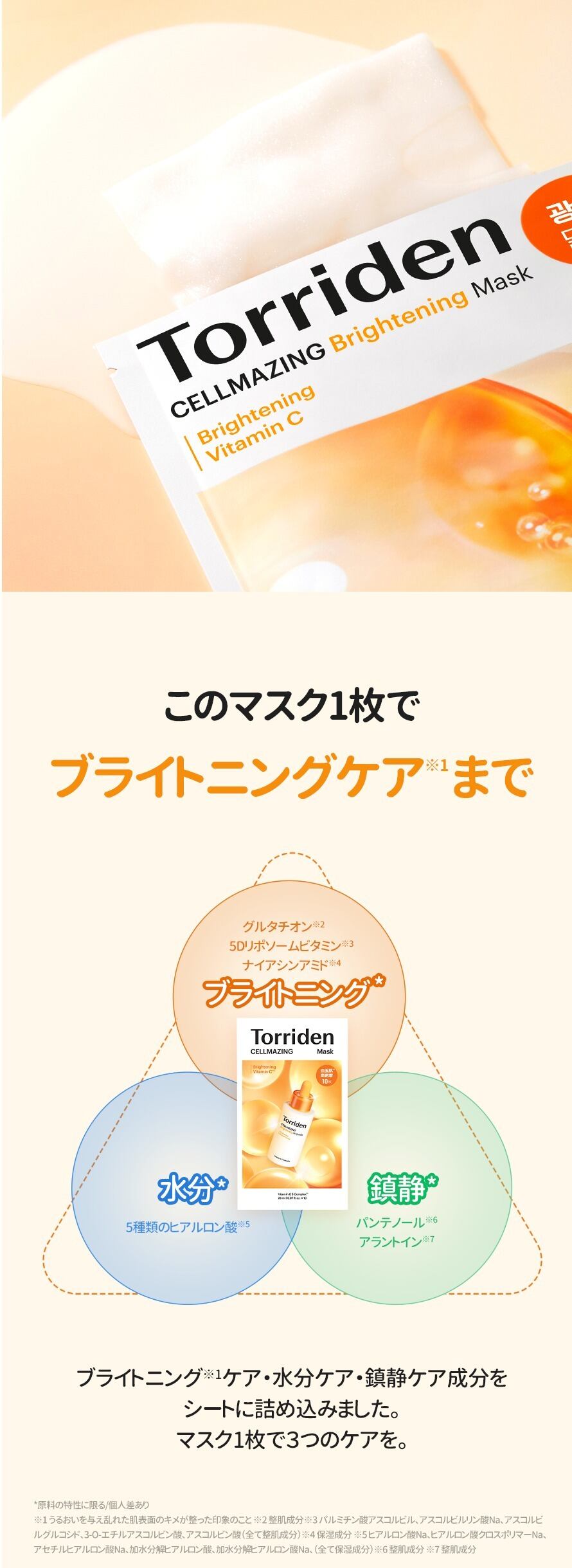 Torridenシートマスクは、厳選された成分を配合し、肌に的確なアプローチを行います。保湿、ひきしめ、そして明るさを引き出す成分がしっかりと働きかけ、あなたの肌をサポートします。