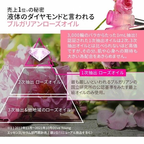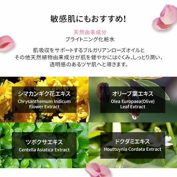 ローズオイルに加え、アルブチンや多数の植物エキス配合で、角質を整え、お肌にうるおいで包み込んで透明肌へ導きます。